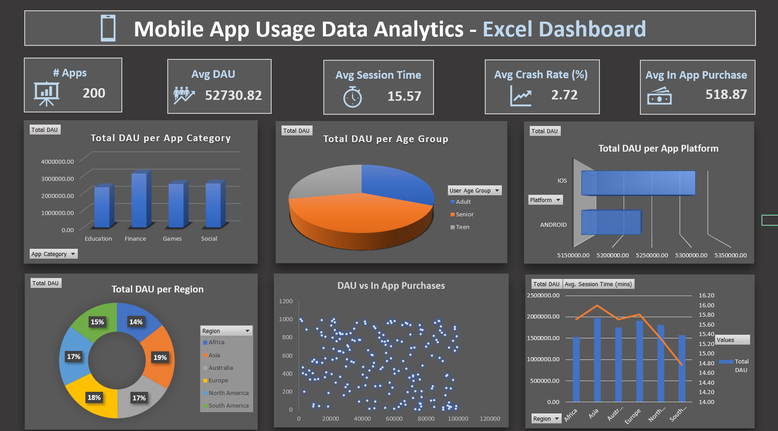 Data analytics dashboards allow professionals to convert raw numbers into meaningful insights. In this tutorial, we’ll create an interactive Excel Dashboard that analyzes mobile app usage trends using real-world inspired data. The goal is to understand how users behave across different app categories, platforms, regions, and age groups — using Excel’s advanced visualization tools.