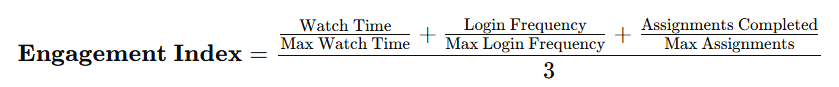Engagement Index is a composite behavioral metric calculated as the average of normalized watch time, login frequency, and assignments completed, used to quantify a studentβs overall learning involvement.